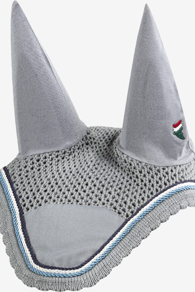 Klassische Fliegenhaube aus gehäkeltem Material mit weichen Ohren. Glattes Patch vorne, das farblich auf den Rest der Haube abgestimmt ist. Drei Kordeln in Hellblau, Weiß und Marine. Gesticktes Logo am linken Ohr.