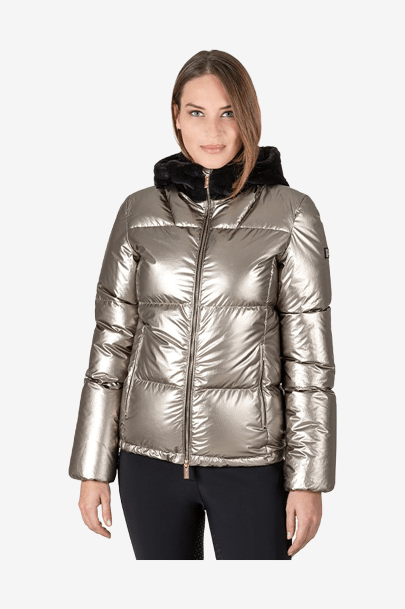 Jacka i dun med stor och mysig huva i eco päls. Jackan har en tvåvägsdragkedja och två fickor som stängs med dragkedja. En snygg och varm jacka som passar både i stallet och på stan.