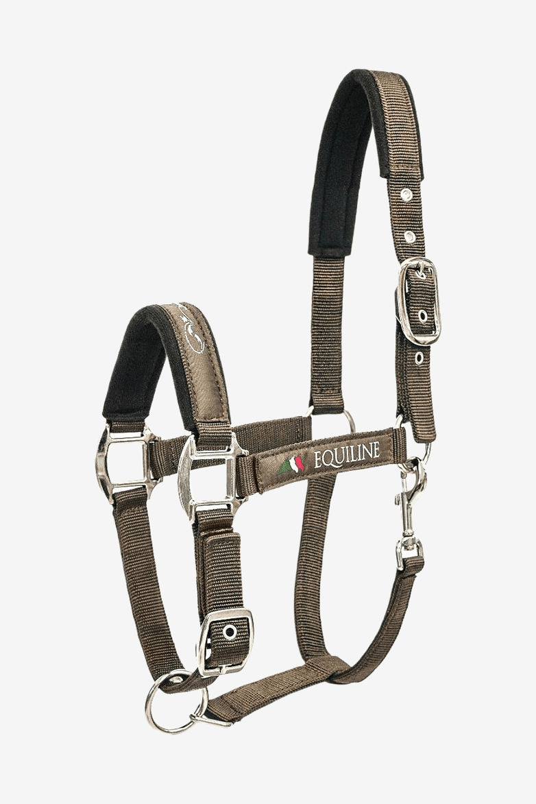 Nylongrimma från Equiline med exklusiv look. Justerbar över nacken och runt nosen med ett spänne. Broderad logga på sidorna med vackert mönster över nosryggen. Grimman är vadderad över nos och nacke.