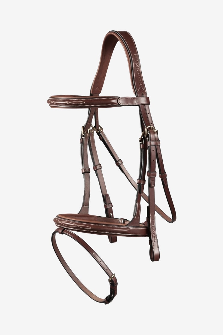 Stilvolle und elegante Trense aus weichem und feinem Leder. Die Innenseite der Trense besteht aus Kalbsleder, das weich und sanft zum Pferdegesicht ist. Abnehmbares Nasenband, nach innen gerichtete Schnallen für einen klaren Look. Silberfarbene Schnallen.