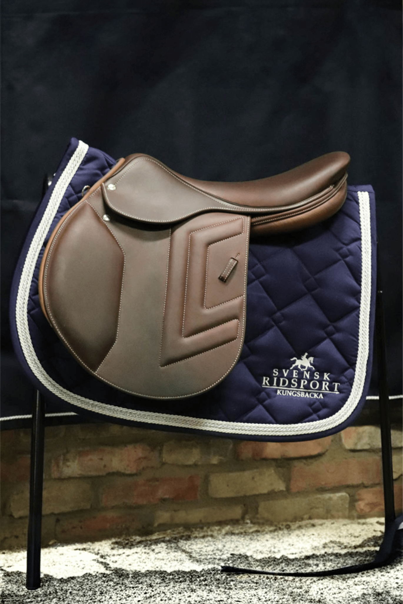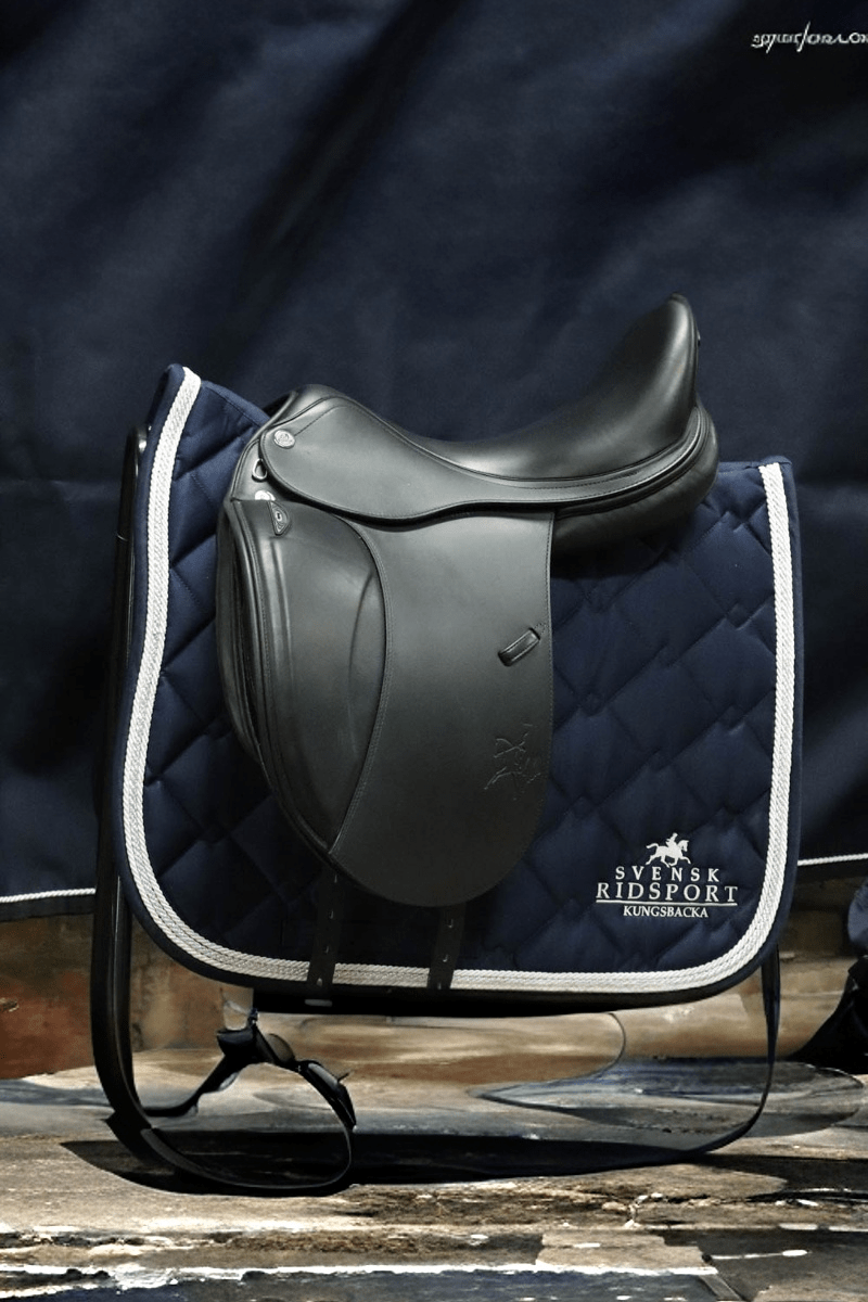 Satteldecke mit Diamantsteppung. Die Innenseite verfügt über ein Wabenmuster, das Feuchtigkeit ableitet. Ein schlankes und elegantes Design ohne Schlaufen zur Befestigung an den Sattelgurtriemen. Drei Kordeln in Weiß und Silber. Gesticktes Swedish Equestrian Logo in Silber auf der linken Seite.