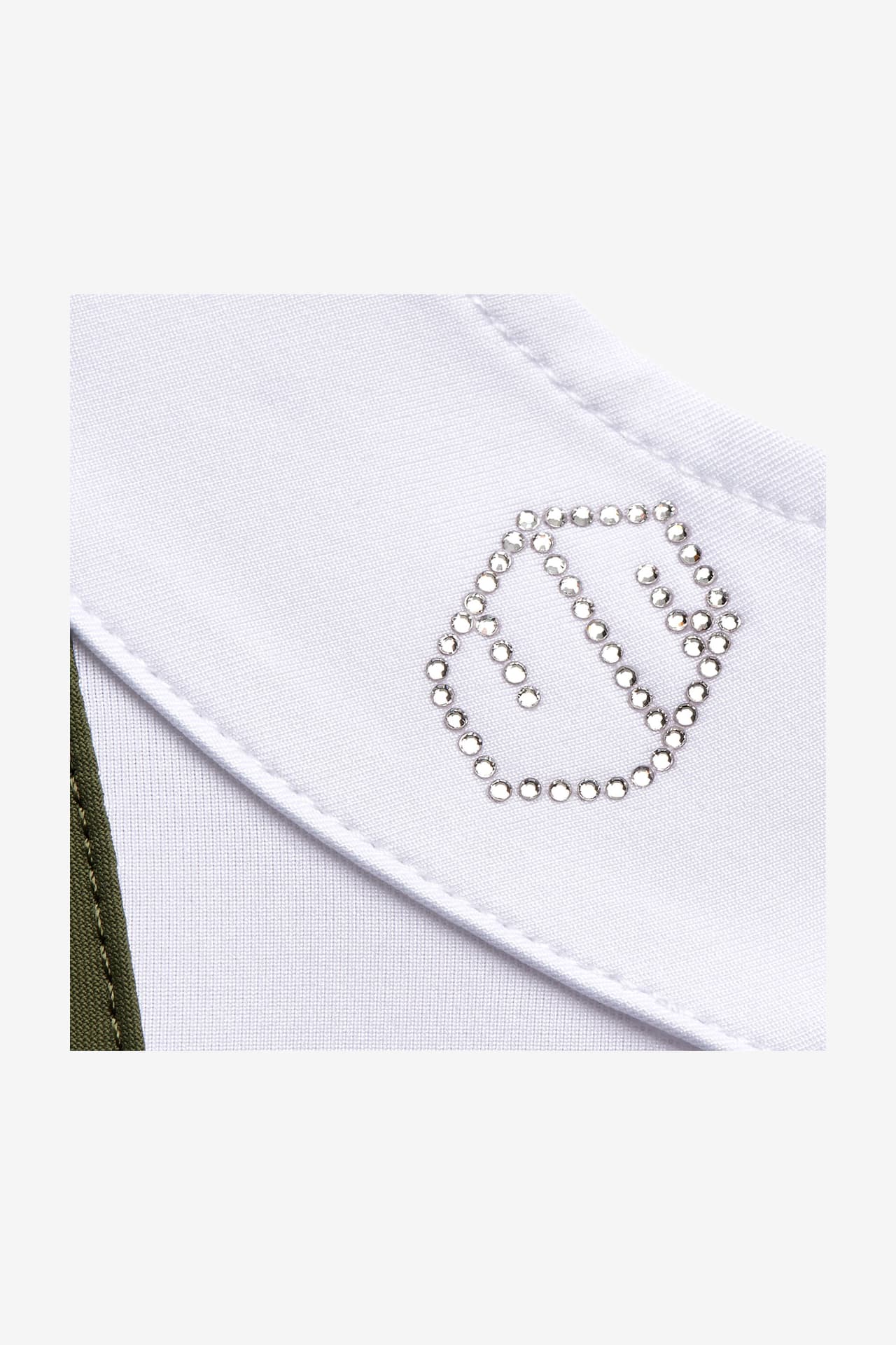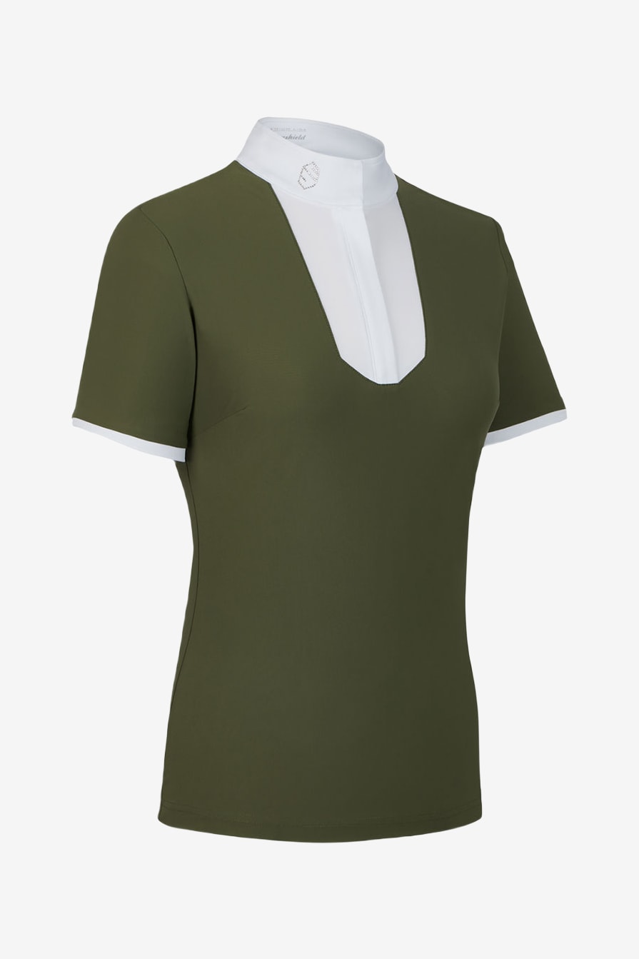 Feminin och elegant tävlingstopp i funktionellt material med snygga detaljer. Apolline är sydd i stretchigt och följsamt material som håller dig bekväm och sval. Vit krage och vitt bröst med Swarovski kristall-logga på sidan av kragen. Ärmsluten är även de vita och ger en snygg inramning av ärmen.