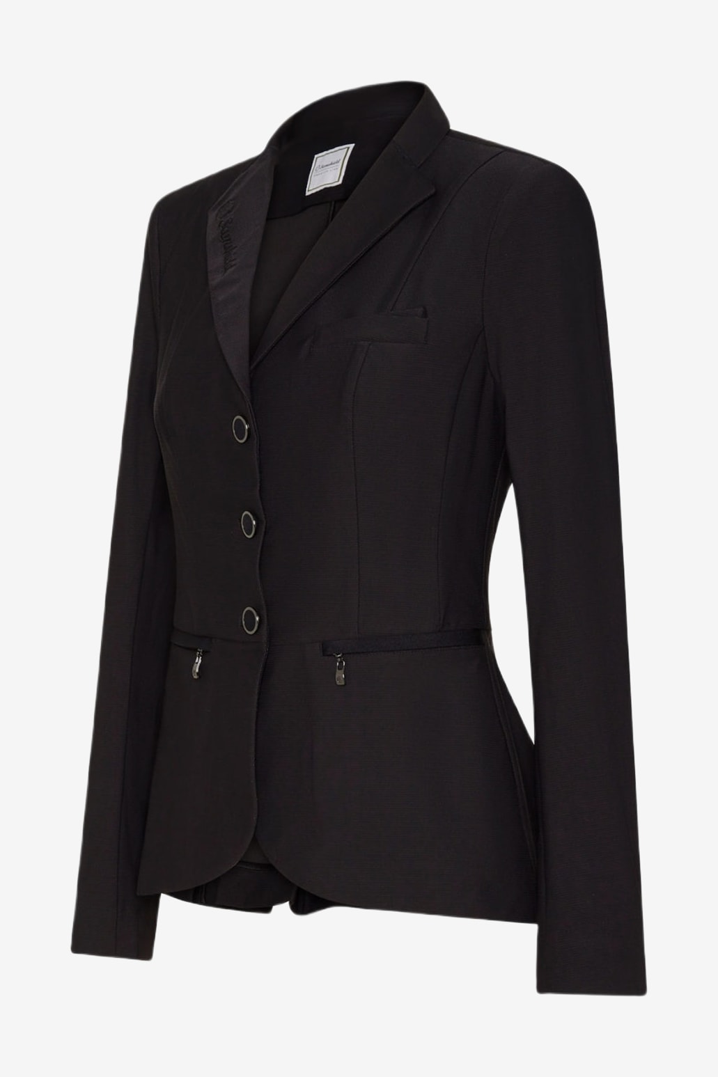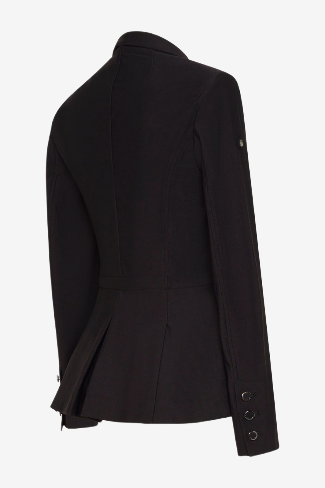 Die Jacke ist so konzipiert, dass sie der Reiterin Komfort und Bewegungsfreiheit bietet. Das taillierte Modell ist vorne etwas kürzer und hinten länger geschnitten, was einen eleganten Eindruck vermittelt.