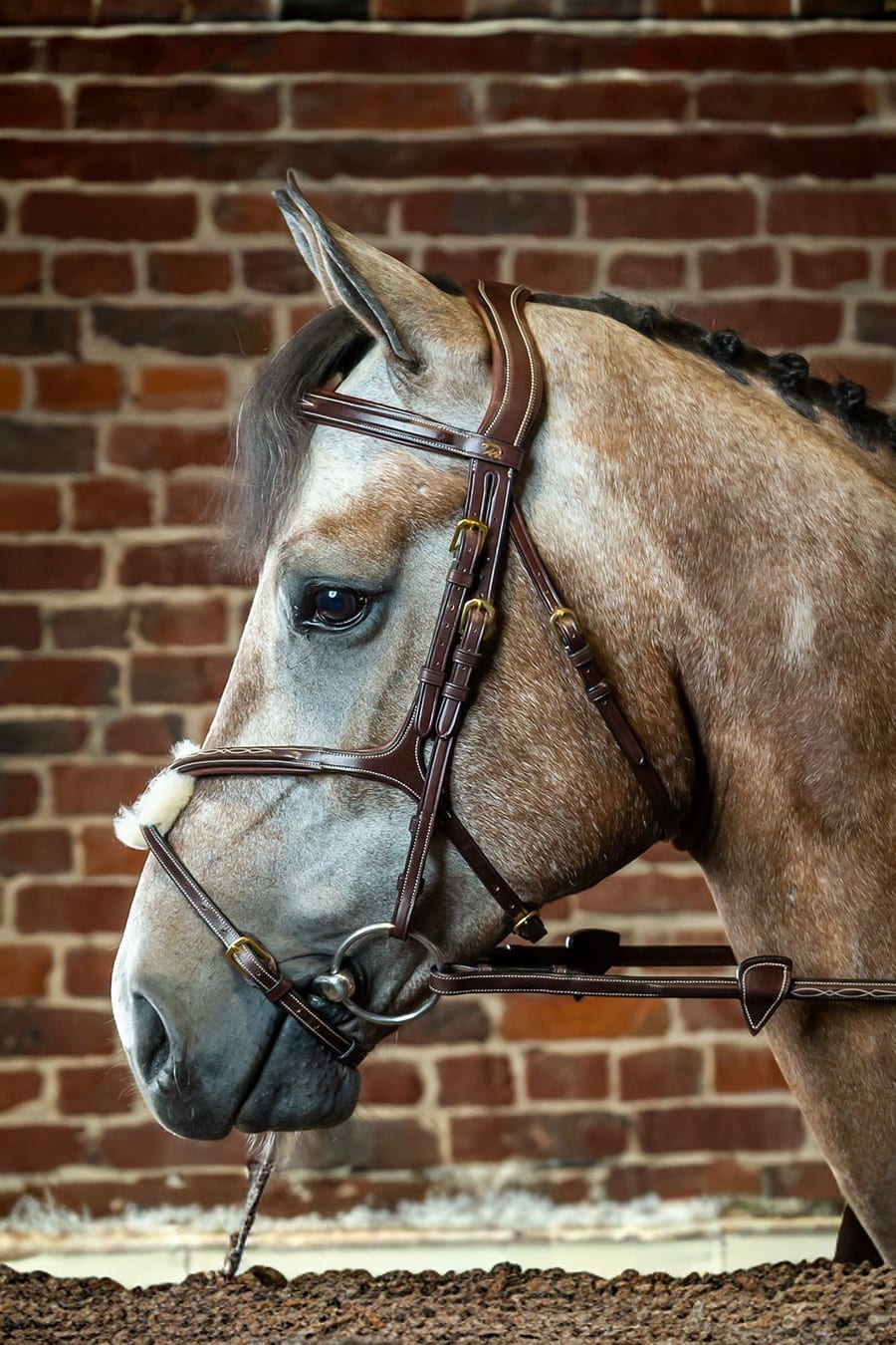 An accessory made of soft leather from Spain with brass buckles and fine white patterned stitching.