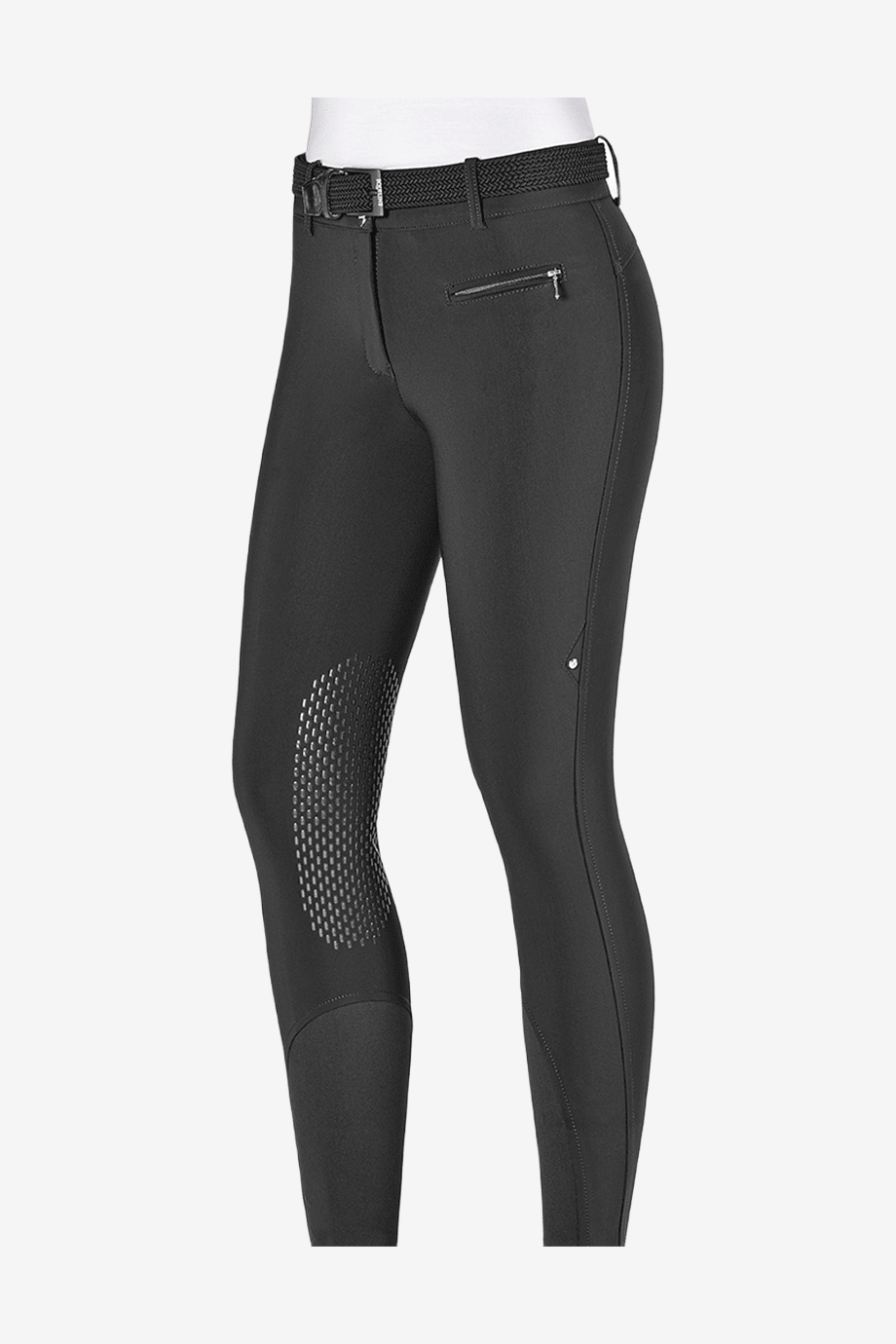 Comfortable riding breeches from Equiline. The breeches have knee patches for extra comfort and protection. At the front, there is a pocket on the left side that closes with a zipper. On the left leg, just above the knee, there is a very nice detail in the form of a silver button. The breeches have cuffs at the bottom for a good fit. On the right hip sits Equiline's fine logo. The riding breeches are made of a material that wicks away moisture very well, is incredibly comfortable, and blocks the sun's UV rays. Additionally, they are very quick-drying. Wash at 30 degrees.