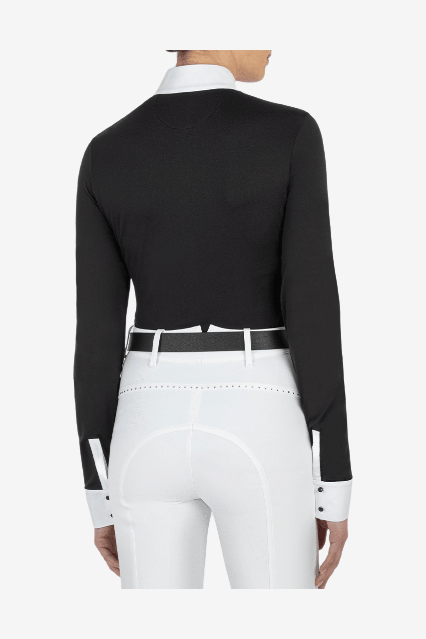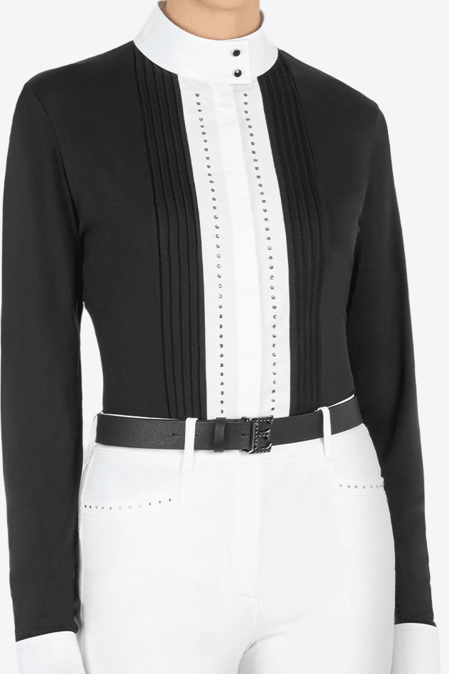 Long-sleeved competition shirt from Equiline with rhinestone details on both sides of the front placket. The shirt features fine detail stitching next to the rhinestones and a stylish neck closure with two black buttons. The same buttons are also at the cuffs. Made from a thin and lightweight material that is very comfortable to wear. The shirt can be washed at 30 degrees.