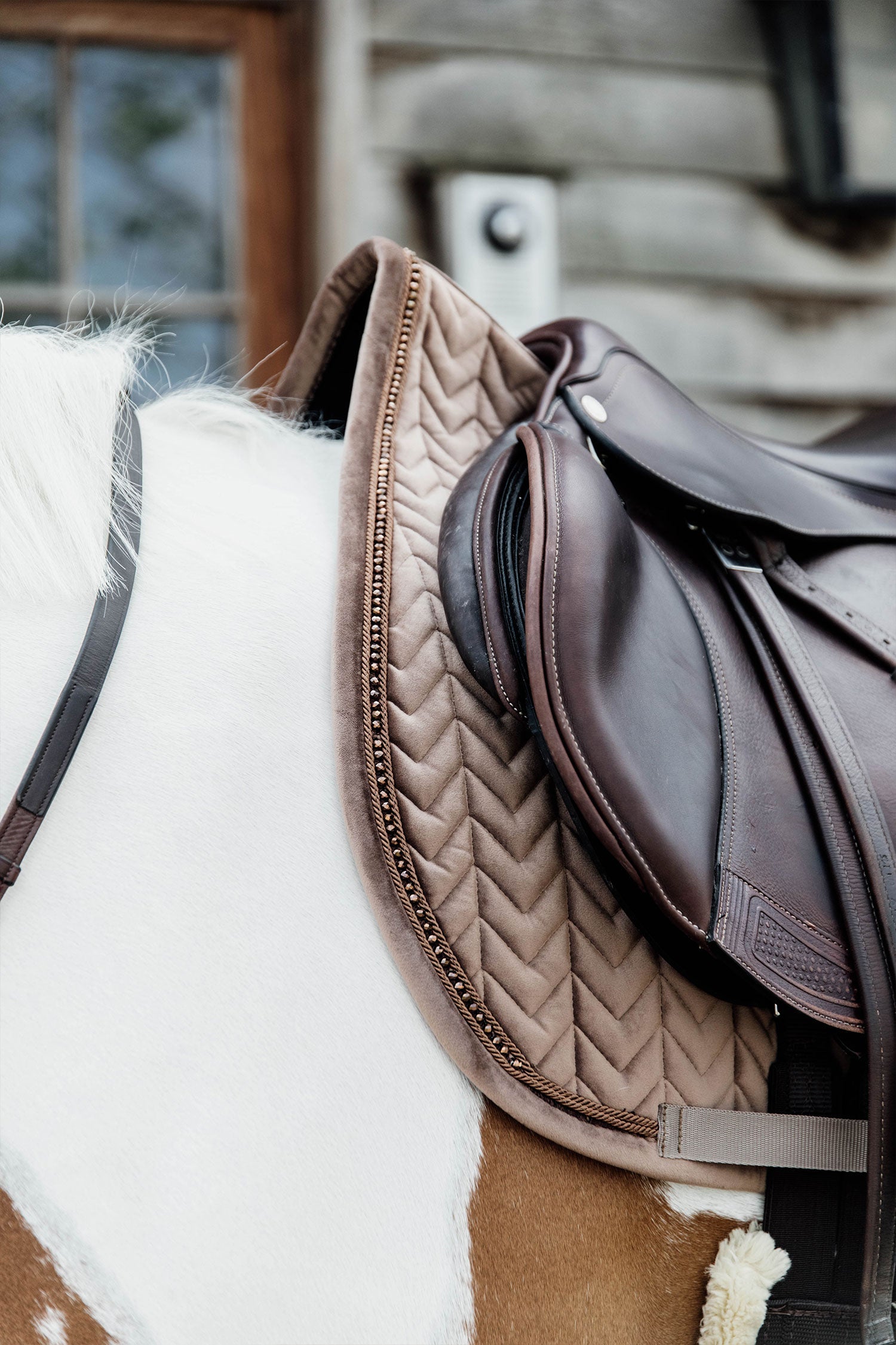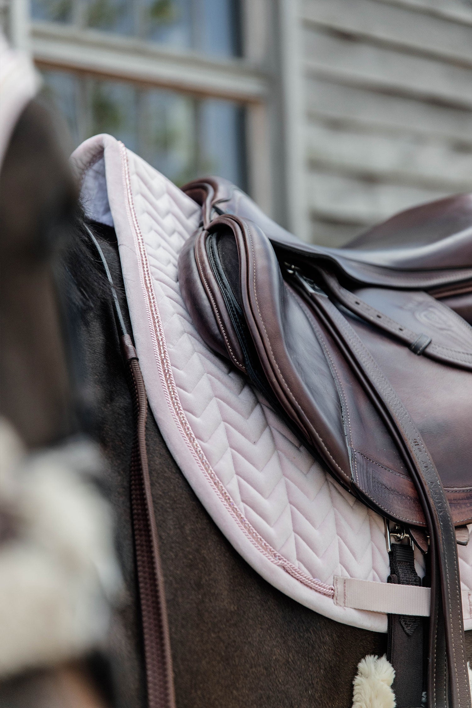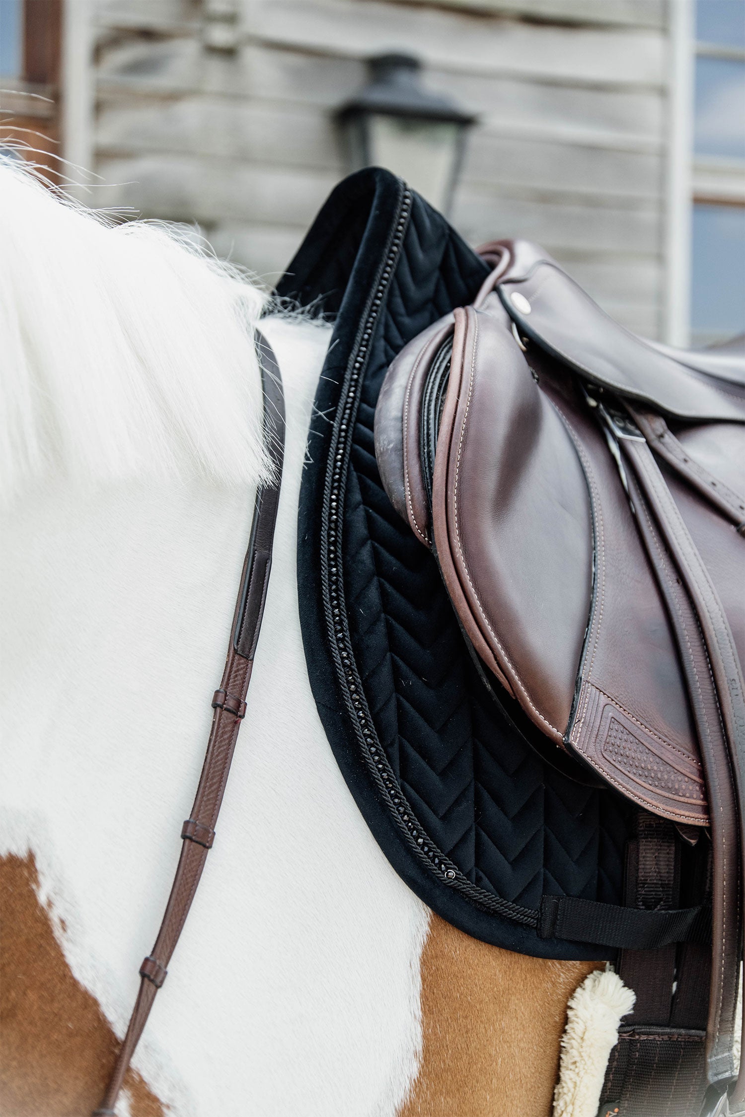 Det här schabraket har inga irriterande remmar att fästa i sadeln, bara en nylonrem för sadelgjorden.