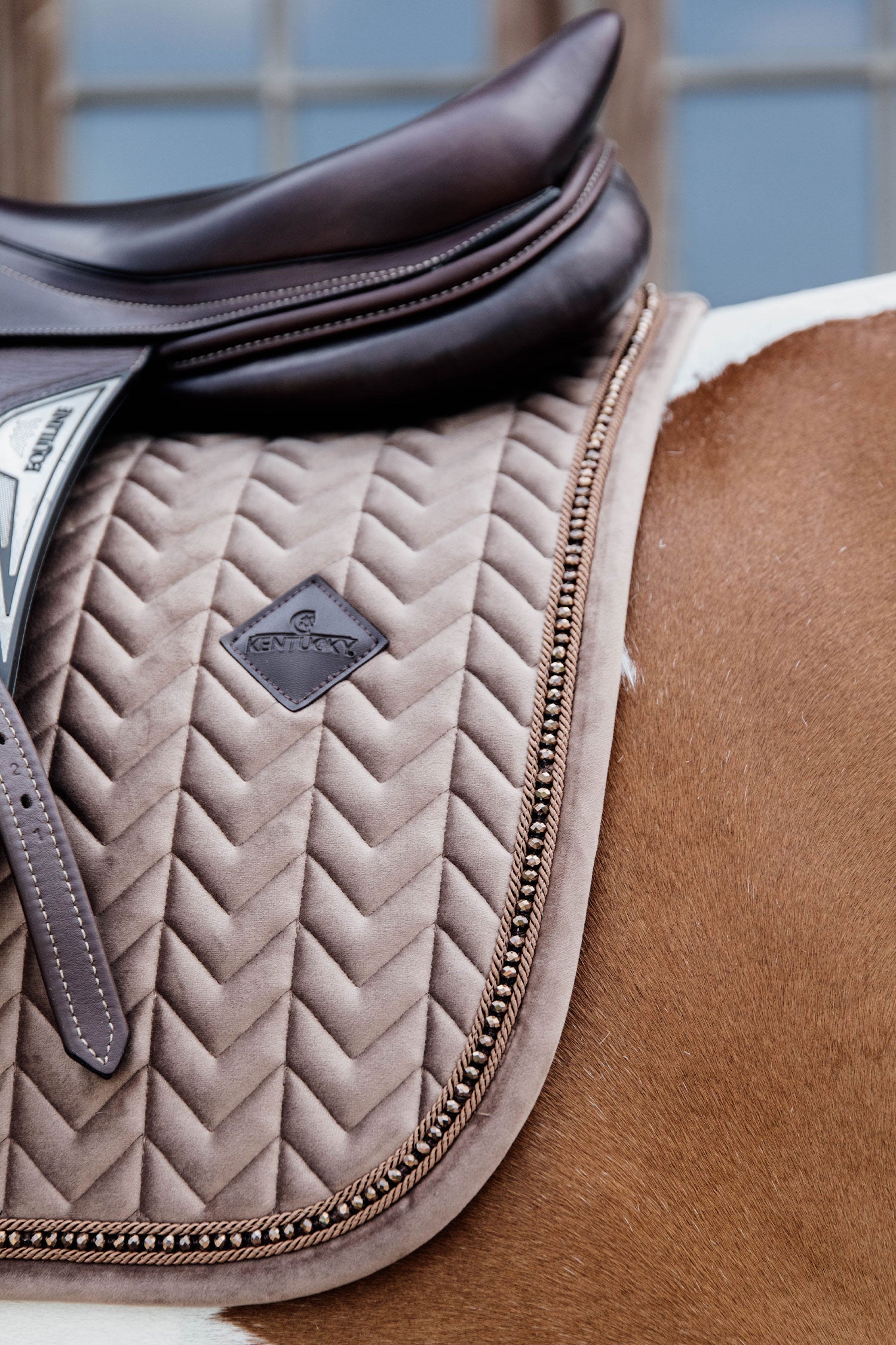 Saddle Pad Velvet Pearls från Kentucky Horsewear är följsamt formad efter hästens kropp och ger utmärkt dämpning mellan hästens rygg och sadeln samtidigt som ryggen skyddas mot friktion.