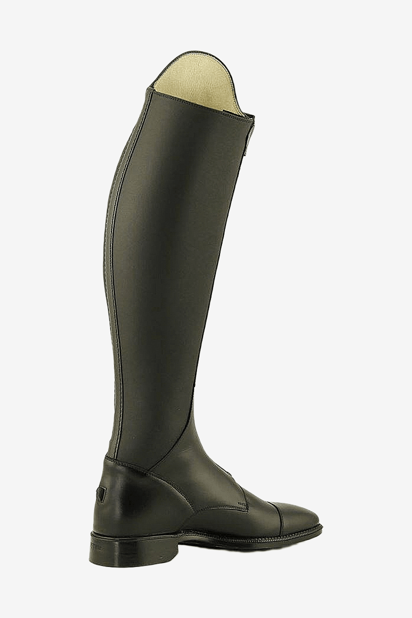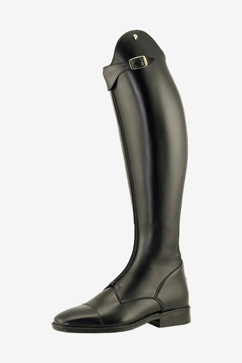 Bottes souples en cuir de vachette, avec cuir à adhérence supplémentaire à l'intérieur de la botte. Détails élégants avec porte-éperons. Fermeture éclair à l'avant le long du tibia, se terminant par une boucle dorée élégante assortie à Petrie Pet en haut de la cambrure. La cambrure mesure 6 cm de haut et donne une belle longueur à la botte.
