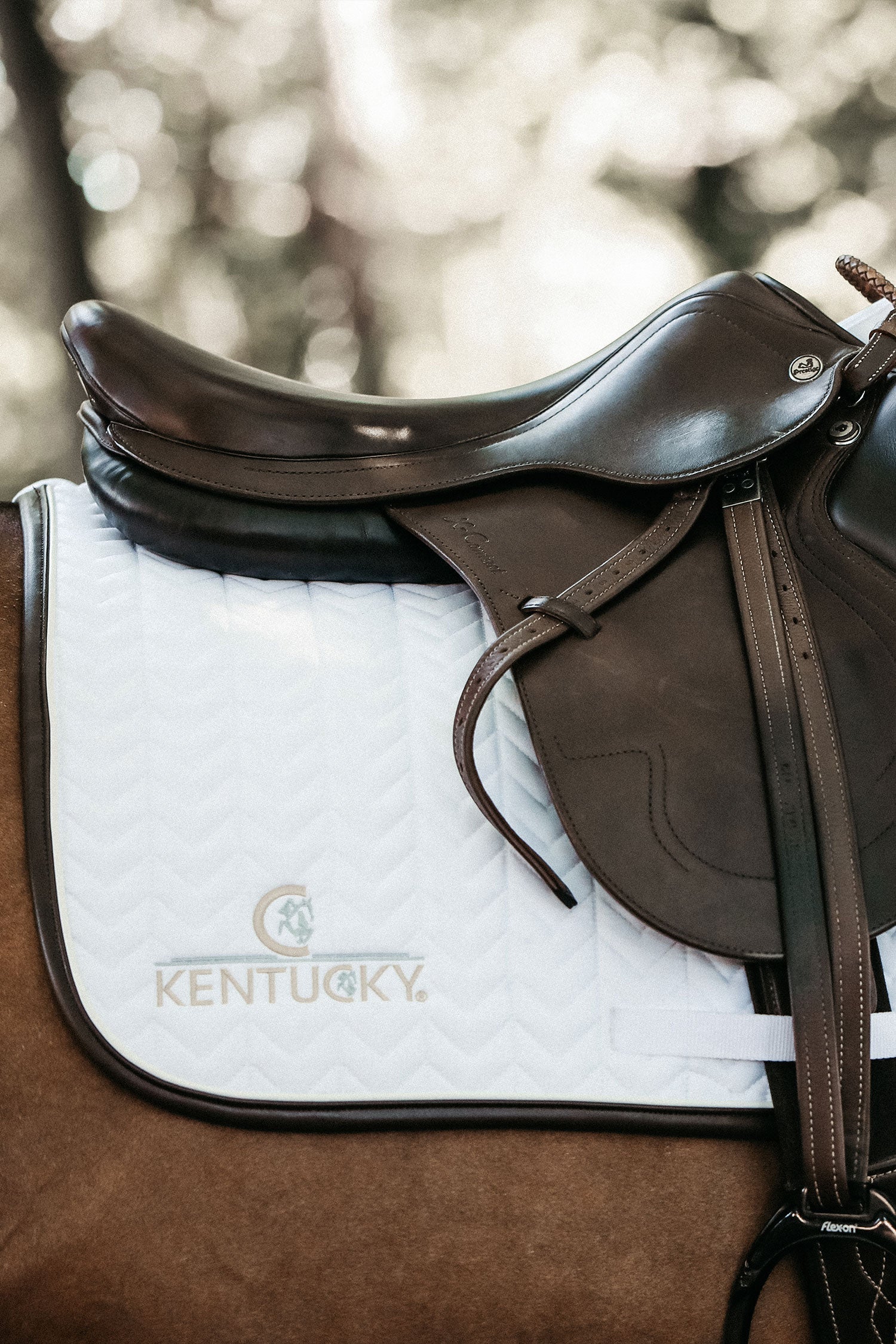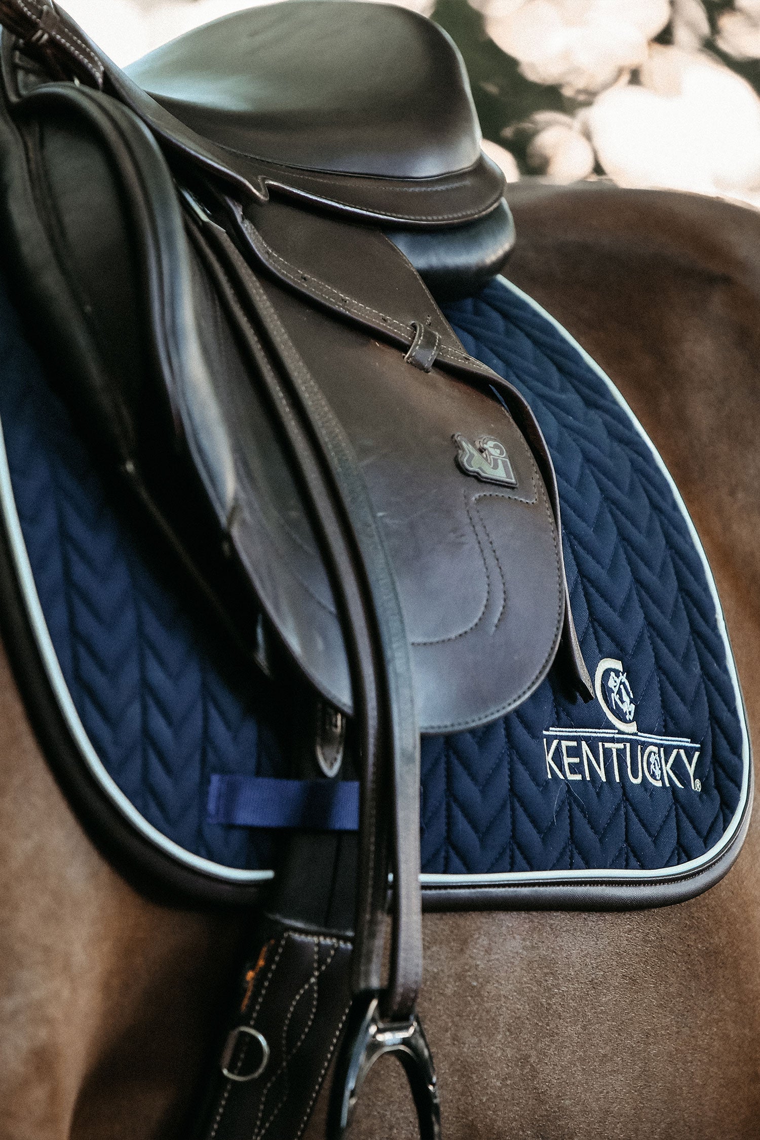 Prachtige springonderlegger van Kentucky. Vormgegeven voor het springen en biedt goede demping tussen de rug van het paard en het zadel, terwijl het beschermt tegen wrijving. Geen zadellussen behalve voor de singel. Stijlvol ontworpen met het Kentucky-logo aan de zijkant en een leren bies.