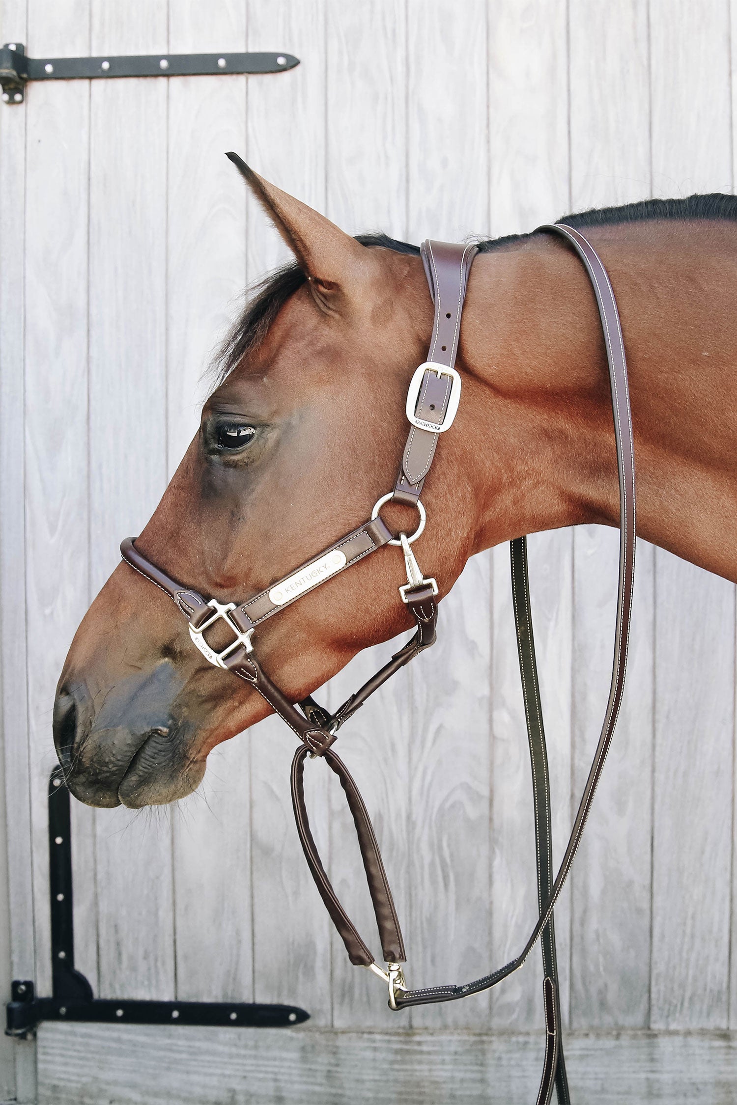 Łańcuch jest pokryty skórą syntetyczną i zapewnia znacznie przyjemniejsze odczucie dla konia niż zwykły łańcuch, nie tracąc przy tym jego działania. Uwiąz ozdobiony jest również stylową złotą tabliczką z wygrawerowanym logo Kentucky, którą można odwrócić, jeśli chcesz spersonalizować ją własnym grawerem.