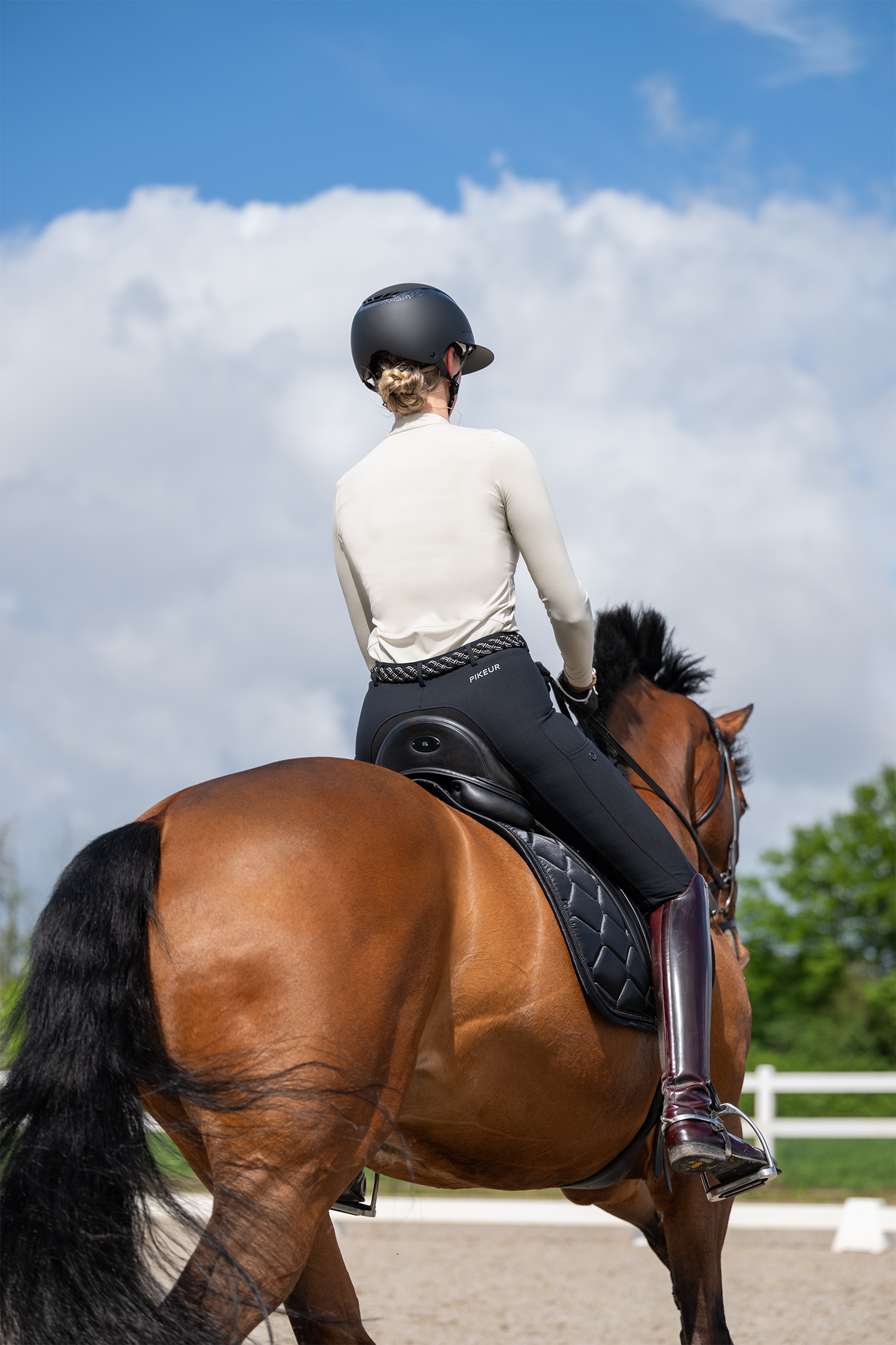Bryczesy New Lugana FFL od Pikeur to zaktualizowany model wykonany z nowego materiału Flex Faux Leather – miękkiej i elastycznej skóry syntetycznej, która zapewnia doskonałą przyczepność w siodle oraz wysoki komfort podczas jazdy. Model posiada średni stan, który wygodnie leży i podkreśla sylwetkę.