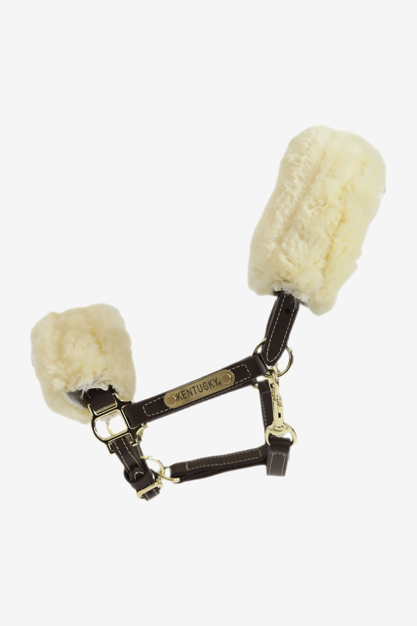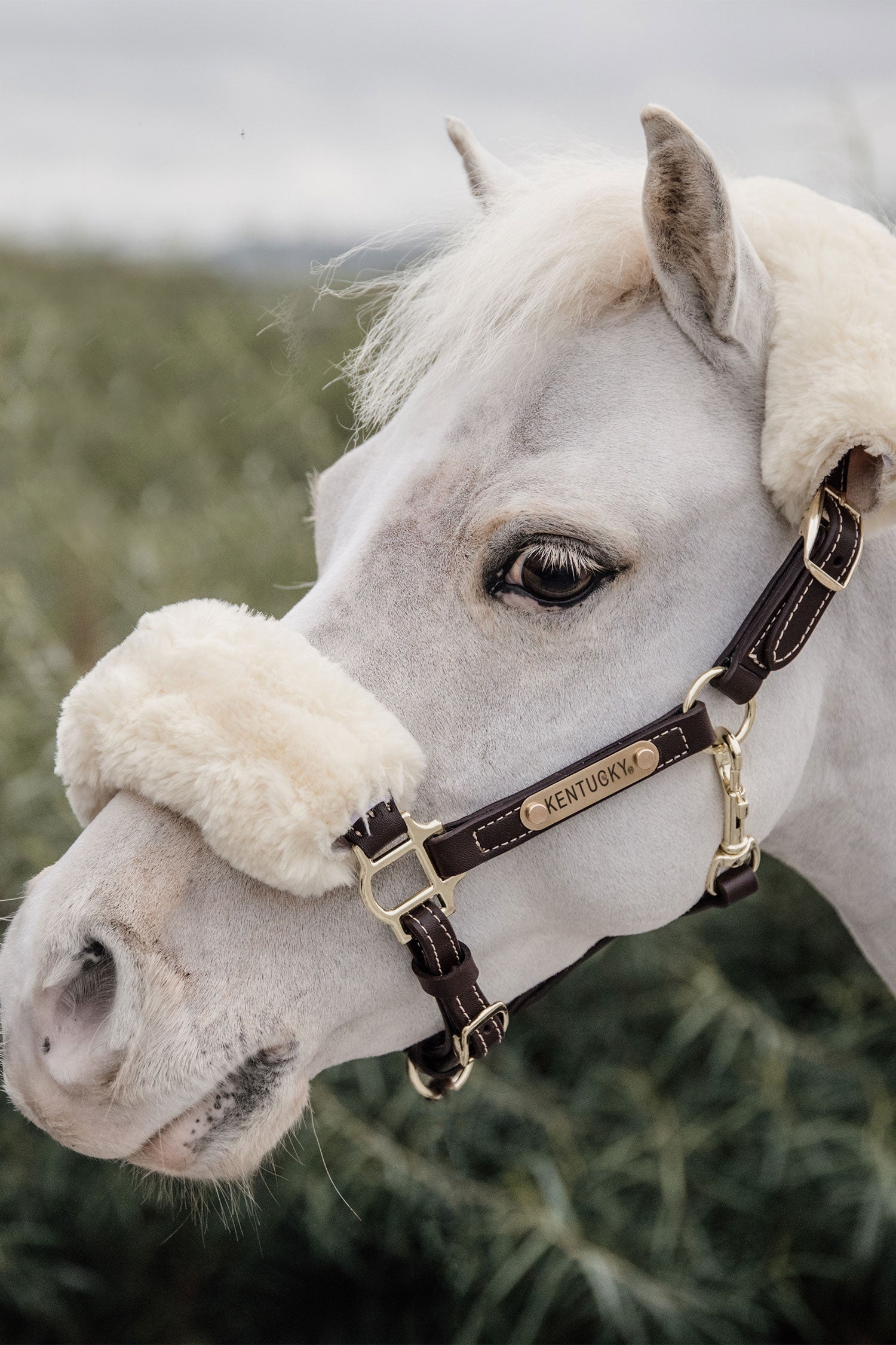 Elegancki i stylowy, z miękkim podszyciem równomiernie rozkładającym nacisk. Wyposażony w przytulne sztuczne owcze futro na nosie i potylicy, które można zdjąć. Regulowany nachrapnik z obu stron za pomocą ładnych mosiężnych sprzączek. Szybkie zapięcie pod ganasz.