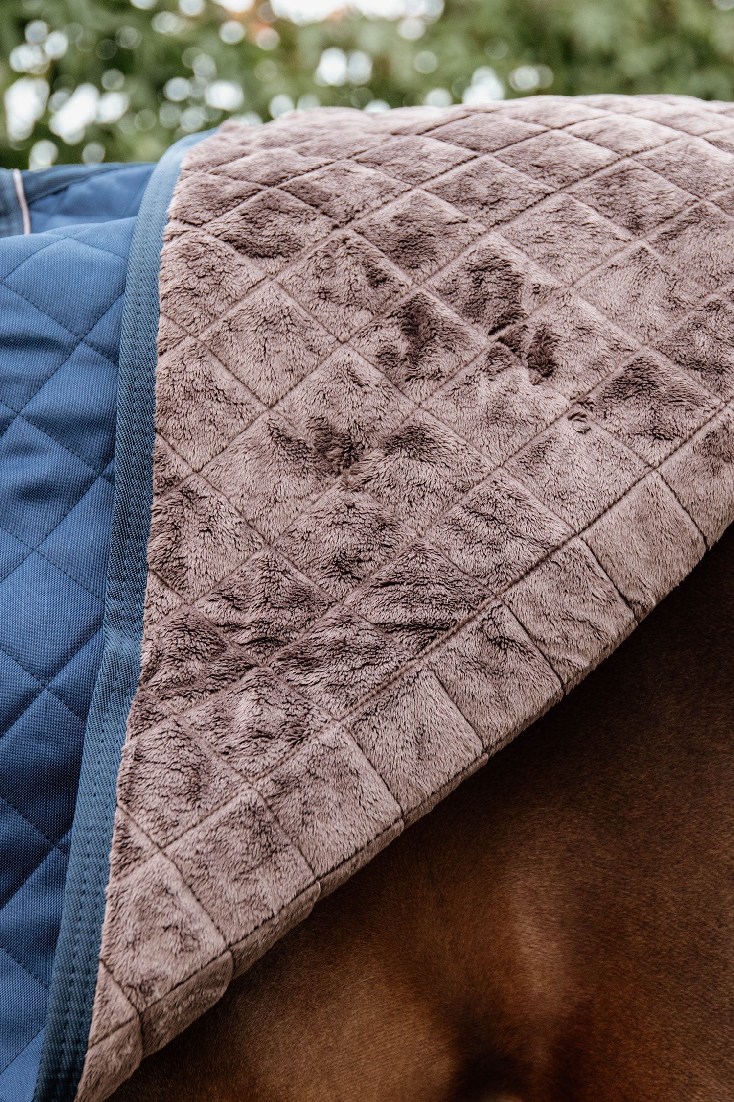 Diamantquiltmønsteret, det brune kunstlæder og Kentucky-logoet i brunt kunstlæder giver Ridedækken 160g et meget stilfuldt udseende.