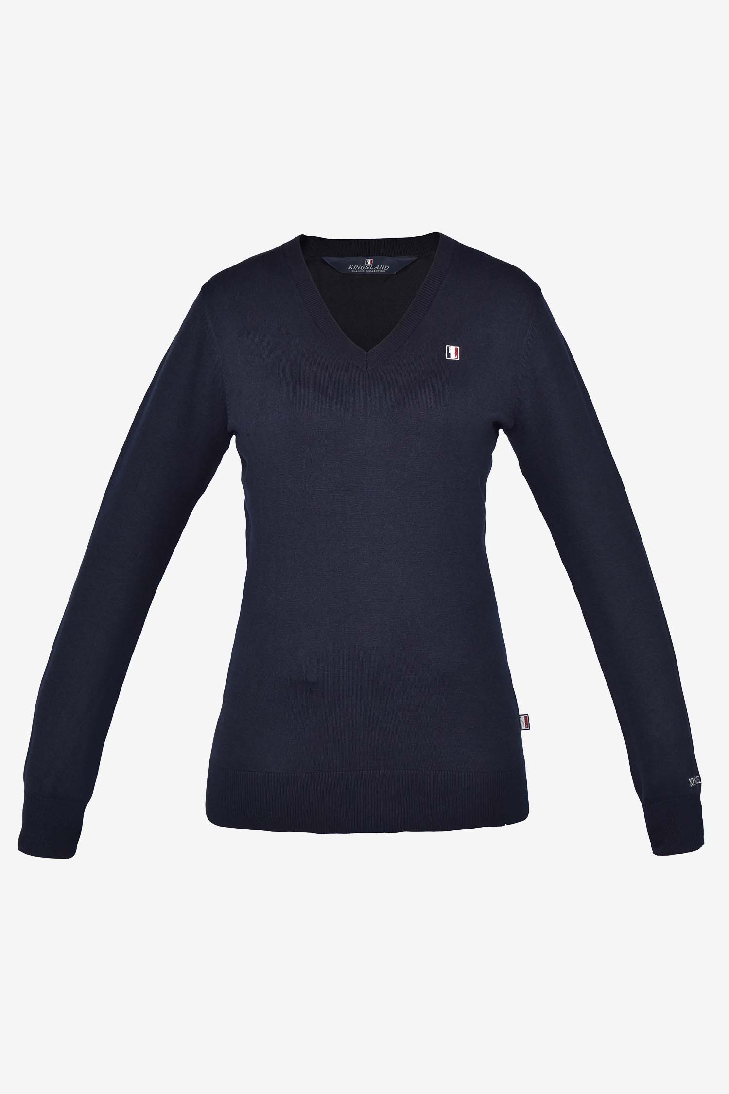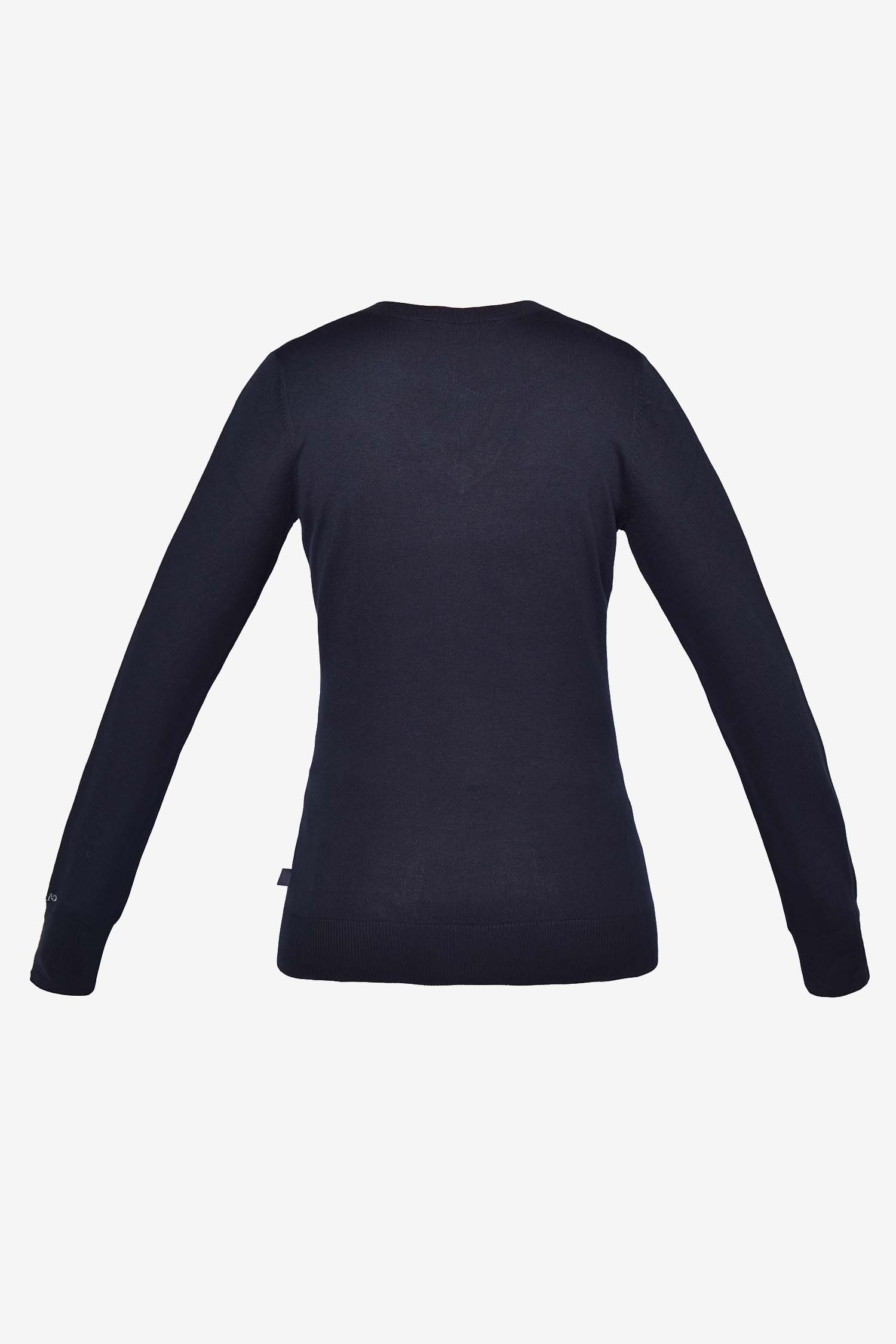 Glattstrikket sweater i damemodel med V-halskrave med 2x2 rib på krave, ærme- og taljekant. Broderet logo på brystet samt på den nederste del af venstre ærme.