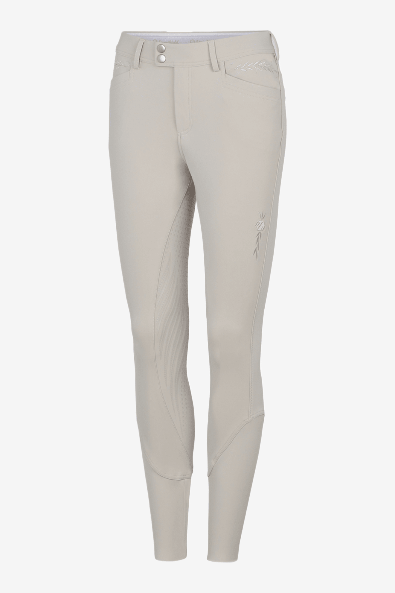 En stilfuld og velsiddende ridebuks med fuld silikonegrip, der sikrer et fremragende greb i sadlen. Fremstillet af et ultratyndt og slidstærkt materiale, der holder formen og giver en meget tæt "anden hud"-fornemmelse. Kompressionsstoffet ved læggen giver fremragende støtte og komfort. Et elegant blomster-/bladmønster broderet over forlommerne og langs bagstykket med Swarovski-krystaller giver bukserne det ekstra eksklusive look.
